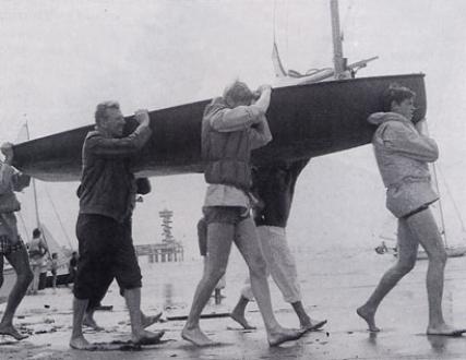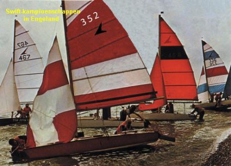 We strandden tenslotte na 8 bange uren, maar waar zaten we? De late badgasten bleken Frans te spreken, pech dus. We belden naar huis; daar bleek men ons al opgegeven te hebben, omdat de storm daar nog heviger was geweest. Bij de KZVS was er al een stemming van: jammer van die aardige jongens, leuk dat we ze gekend hebben". De volgende dag zeilden we naar het noorden, een korte pauze bij Oostende om te drogen (natte pakken bestonden toen nog niet) en landden tenslotte om 8 uur 's avonds in Domburg. Bellen naar de KZVS: wat nu? In Scheveningen werd onmiddellijk actie ondernomen en een expeditie uitgerust. Gebroken mast (jawel van de Vaurien) op een trailer, een paar auto's en onder leiding van Wim Bouman werden we om 12 uur's nachts door onze vrienden opgehaald (zie voor een uitgebreid verslag van deze overtocht). En toen mijn mooiste zeilzomer. Ik was uniek en superieur met de Swift: een wereld van verschil met de toen in een klap verouderde Vauriens. Wanhopige pogingen om mij bij te houden. Vauriens werden uitgerust met boegspriet en spies. Niets hielp; de Swift was het ultieme concept. Mijn “Einzelfahrt" duurde natuurlijk maar een zomer. Rien moest er ook een (luxe uitgevoerd), Dick Krul, weer een trendsetter, de eerste met rode zeilen: de Rode Pimpernel. Wat het nog spannender maakte, was het feit dat alle Swifts werden gesmokkeld. Invoerrechten betaalden we natuurlijk niet. Cees de Gier, Wim Wories, Luc Verkoren, velen volgden. Gerard wilde toch zelf blijven bouwen en kocht de rompschalen van de kleinere Swift, de Junior.